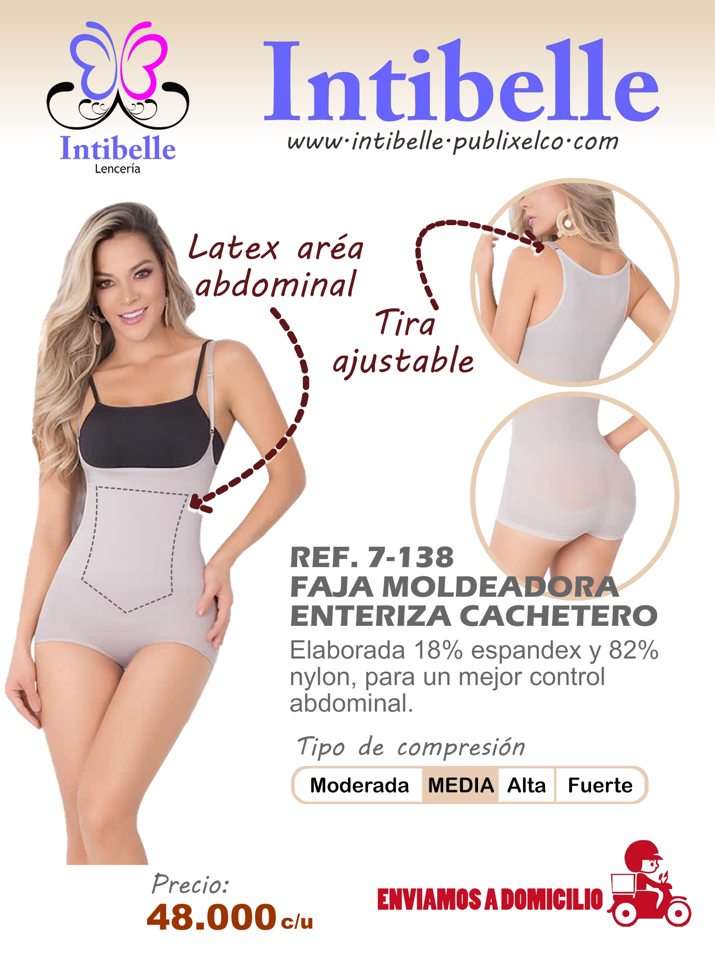 Faja body con levanta cola, posee látex interno de alta compresión en el área del abdomen, incluye ganchos ajustables en la parte inferior.